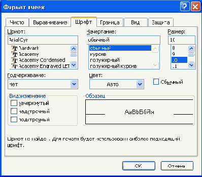 - Изменить некоторые параметры шрифтов можно также в диалоговом окне Формат ячеек. В частности, расположение текста можно изменить, либо введя угол поворота текста в поле ввода градусов, либо щелкнув на отметке с нужным значением угла в окне просмотра справа. Слово Надпись повернется на заданный угол. Вернуться к обычному горизонтальному расположению текста можно, щелкнув на отметке 0°.